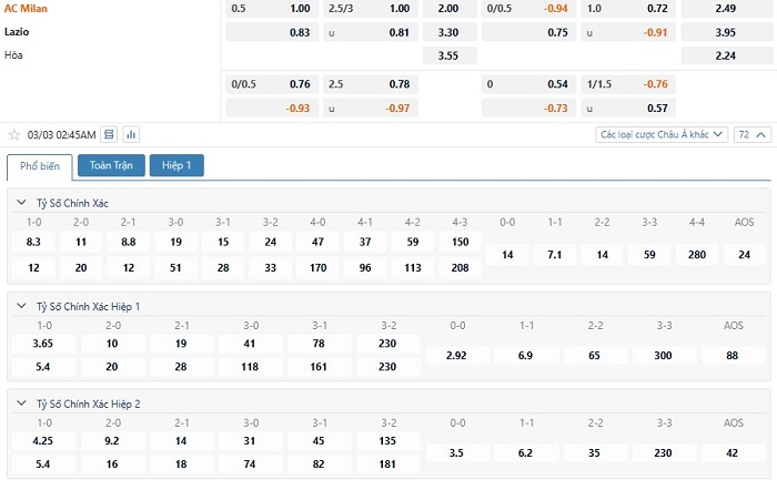 Bảng tỷ lệ kèo bóng đá trận đấu AC Milan vs Lazio